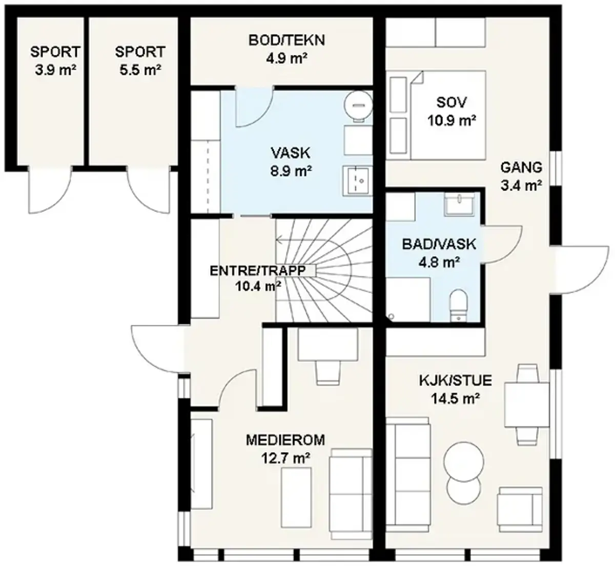 - Fleksibilitet - Eget medierom i 1. etasje. Kan brukes til tv-stue, gjesterom eller ekstra soverom
